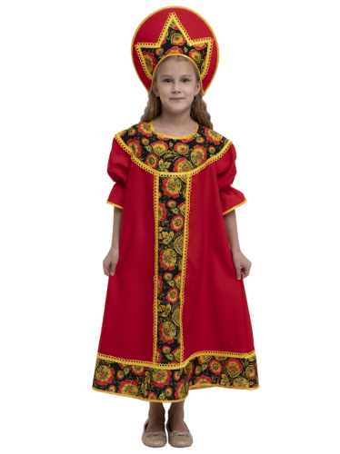 Костюм состоит из сарафана на бретелях, рубашки с застежкой на пуговице, кокошника на резинке. Бретели регулируются при помощи пуговиц.