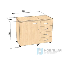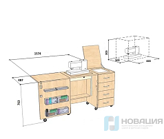 В корпусе 3 выдвижных ящика, сюда можно поместить оверлок. Роликовые опоры дополняются стопорами. Распашная дверца оснащается лотками для принадлежностей.