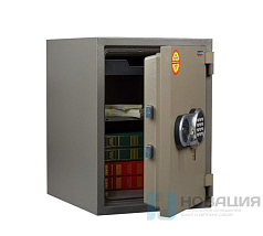 Конструктивно сейф выполнен с применением запатентованного огнестойкого бетона, залитого между стенками корпуса и двери. Дополнительную защиту обеспечивает тепловой замок в области притвора дверцы, усиленный огнестойким уплотнителем.