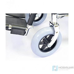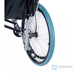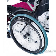 Колеса изготовлены из резины и накачаны воздухом, обеспечивая плавность хода. Передние колеса вращаются вокруг собственной оси, что упрощает маневрирование. Задние колеса снабжены особыми дисками, позволяющими перемещаться самостоятельно. Для транспортировки с помощником предусмотрены удобные рукоятки с покрытием из резины.