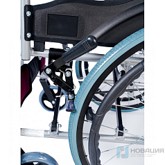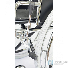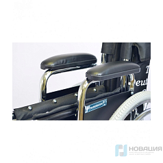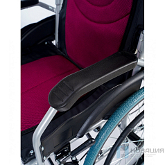 Оборудована удобной системой для облегчения посадки: ступенчатые подлокотники с мягким покрытием и поворотные съемные подножки с возможностью изменения длины. Особенностью подлокотников является возможность приближения кресла непосредственно к поверхности стола или препятствий.