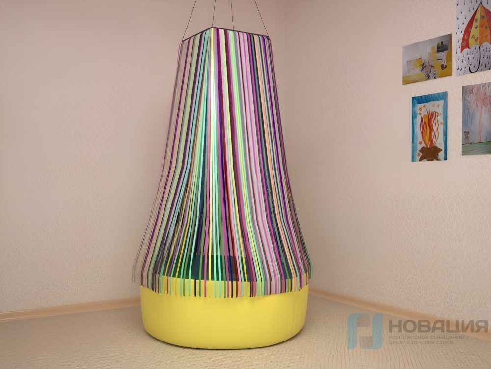 Уголок предназначен для сенсорной комнаты. Зона поможет ребенку расслабиться, снять напряжение и беспокойство. Мягкий островок комфортный для сидения, а цветные ленточки оказывают цветотерапевтический эффект.
