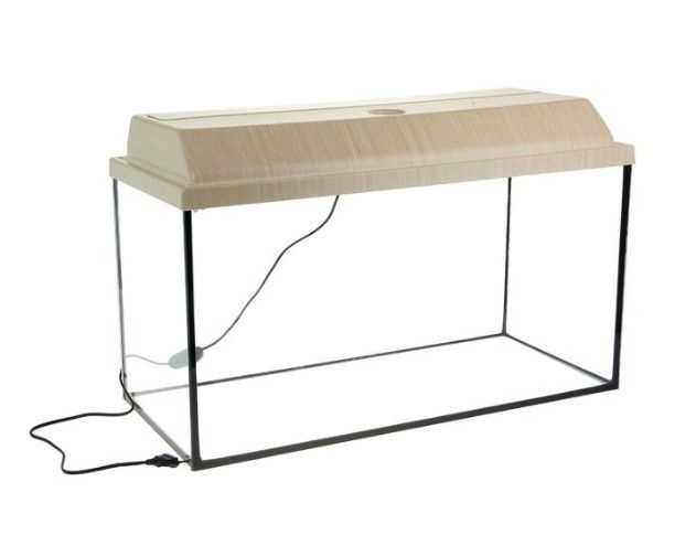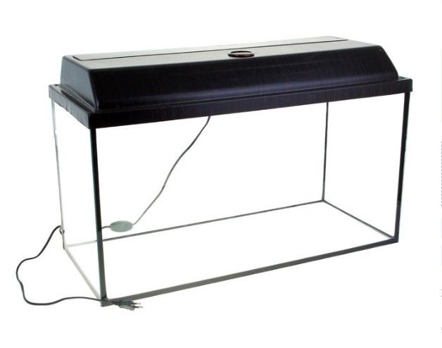 Прямоугольный аквариум с рельефной крышкой оснащен специальным отверстием для кормления рыб, встроенной лампой и переключателем на шнуре.