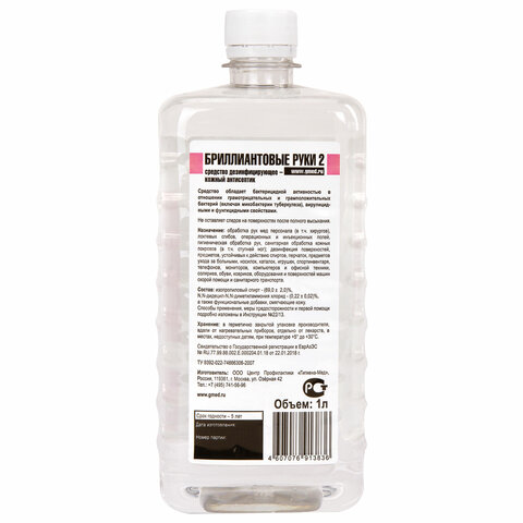 Антисептик для рук и поверхностей спиртосодержащий (69%) 1л БРИЛЛИАНТОВЫЕ РУКИ-2, дезинфицирующий, жидкость