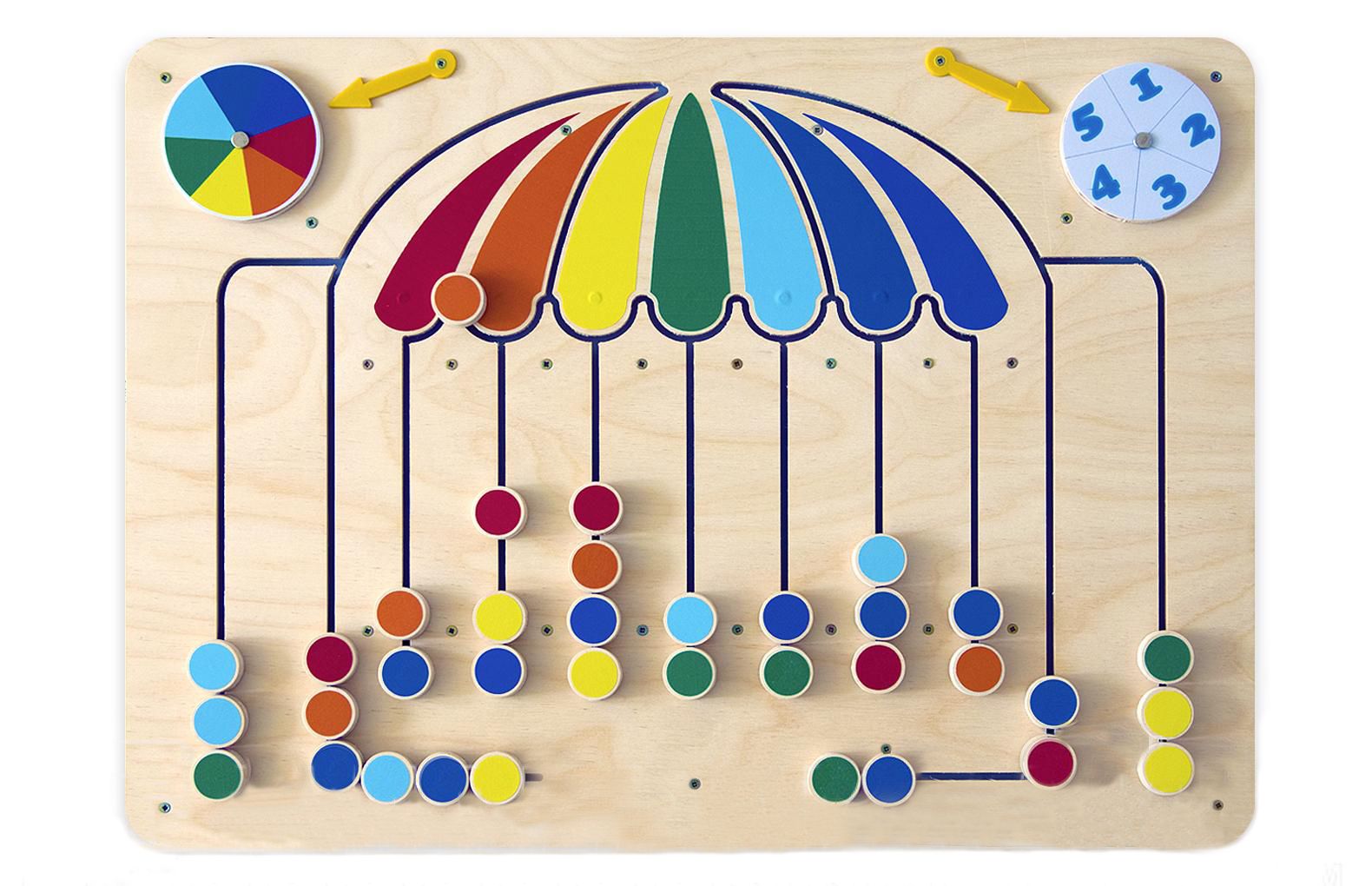 Цветной бизиборд для кабинета психолога, логопеда или рекреационной зоны ДОУ представлен движущимися элементами и желобами лабиринтов. На гладкой панели изображается зонт с фишками в виде капелек. Вращением циферблатов определяется, на какое количество шагов передвинется фишка определенного цвета. Ребенок учится считать и запоминает названия цветов, совершенствует мелкую моторику.