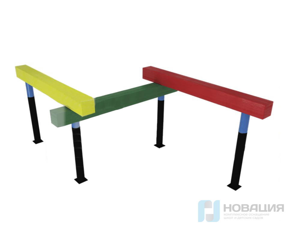 Ножки изделия выполнены из металлической трубы, покрытой полимерно-порошковой краской, устойчивой к воздействию неблагоприятных погодных условий и ультрафиолетовых лучей. Бревно изготовлено из бруса хвойных пород, покрытого специальной пропиткой, это сокращает риск травмирования детей, а так же воздействия влаги на древесное полотно.