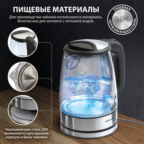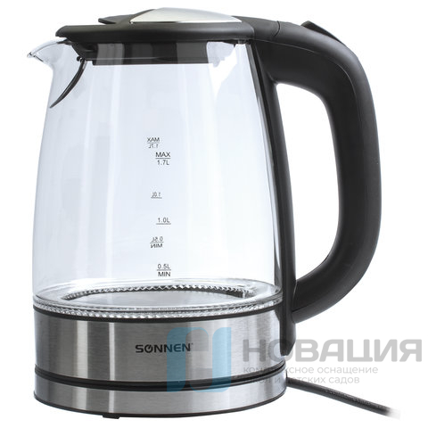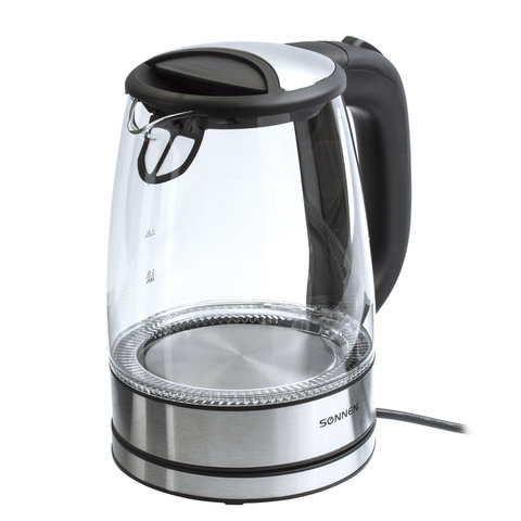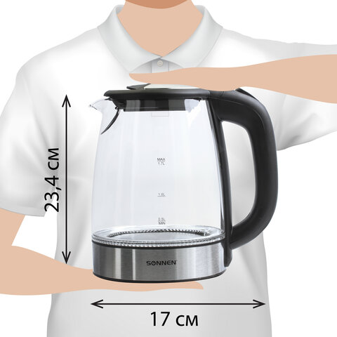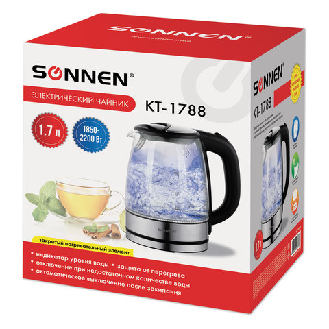 Чайник SONNEN KT-1788, 1,7 л, 2200 Вт, закрытый нагревательный элемент, стекло, черный, подсветка, 454349