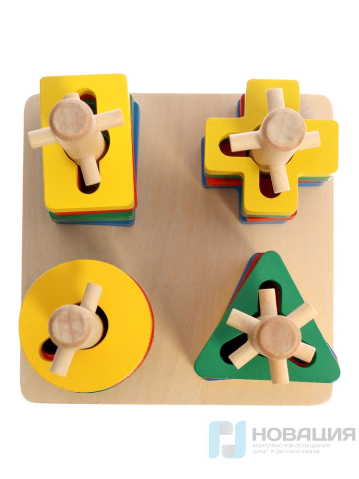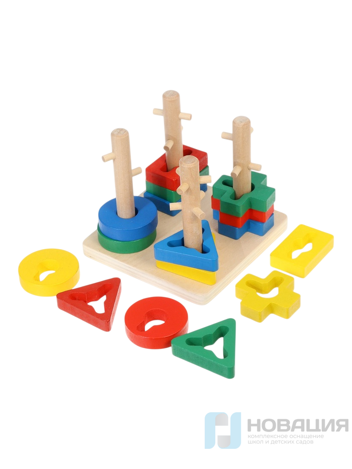 Развивающая игрушка для знакомства с формами и цветами. Ребёнок надевает на стержни детали 4 форм (круги, квадраты, треугольники, крестовины) 4 ярких цветов.