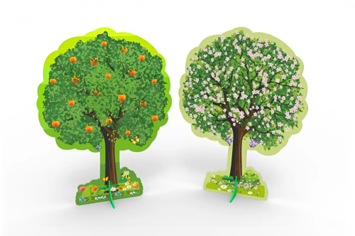 Конструкция размещается в ДОУ, прочные подставки не дают панели упасть. С обеих сторон на поверхность панели наносится изображение дерева. На одной стороне дерево украшается весенними цветами, на второй плодами. Углы декорации закругляются.