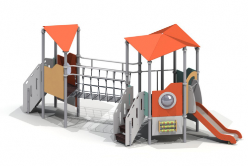 К башне с 2-хскатной крышей пристроены лестница и мост. Вторая башня прикрыта 6-тискатной крышей. Одно из фигурных ограждений дополнено иллюминатором. Внизу закрепляется игровая установка, с других сторон: лестница, горка и начало мостика. Полы и ступени конструкции не скользят. Защитная секция горки окружена аркой.
