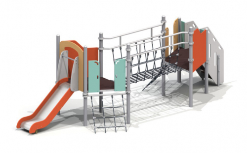 Верхушки стоек прикрыты пластиковыми заглушками. Лестница и площадки не скользят. Защитную секцию обрамляет декоративная арка. Изогнутый скат помогает безопасно приземлиться.