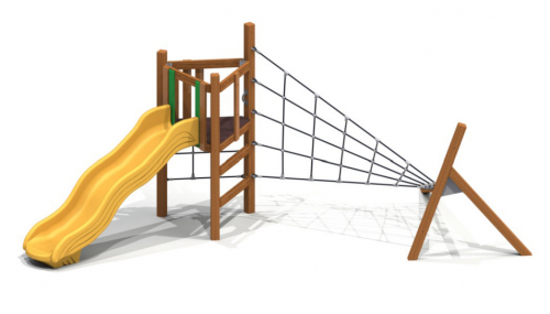 Пластиковая горка с волнообразным скатом крепится к площадке с ограждениями, без крыши. В комплексе предусмотрены перекладины и сетка для лазанья. Наклонные и вертикальные несущие столбы дополнены оцинкованным крепежом для канатов. Скат оснащен бортиками, защитной секцией.