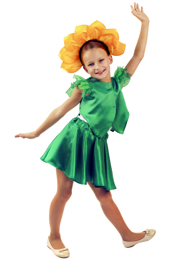 Выполнен из креп-сатина двух цветов. Состоит из расклешенной юбки и жилета зеленого цвета. Юбочка по талии присобрана резинкой, жилет спереди застегивается при помощи липучек, рукава украшены лоскутами ткани, имитирующими лепестки. Дополняет цветочный образ яркий ободок, выполненный в форме цветка подсолнуха.