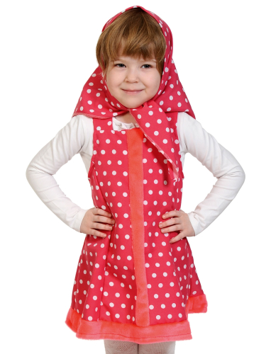 Костюм для девочки включает сарафан и косынку. Украшен принтом в горошек. Бретели сарафана регулируются. Подходит для проведения спектаклей, сценок и костюмированных представлений.