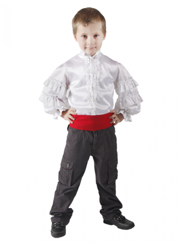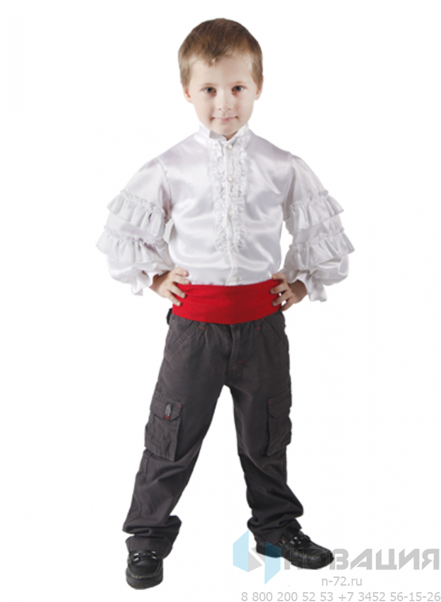 Рубашка выполнена из белого креп-сатина, объемные рукава будут эффектно смотреться в период танцевальных конкурсов. Ярким акцентом образа является широкий красный пояс, выполненный из трикотажной ткани. Рекомендуем дополнить образ брюками темных тонов и классическими туфлями в цвет брюк.