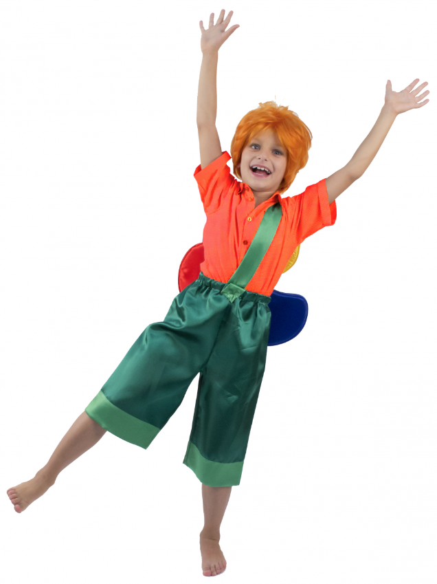 Костюм выполнен из мягких материалов, широкий силуэт не будет сковывать движения даже самого энергичного ребенка. На бриджах предусмотрена помочь (полоса ткани), надевающаяся через плечо, к которой закреплен разноцветный пропеллер. Ярко-рыжий парик выполнен из качественных искусственных волос, при аккуратном использовании его можно расчесывать.