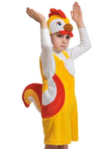 Детский костюм предназначен для мальчиков. Состоит из шапочки в виде головы петушка и полукомбинезона с хвостом. Бретели полукомбинезона регулируются. Подходит для проведения утренников, постановки сценок и сказок.