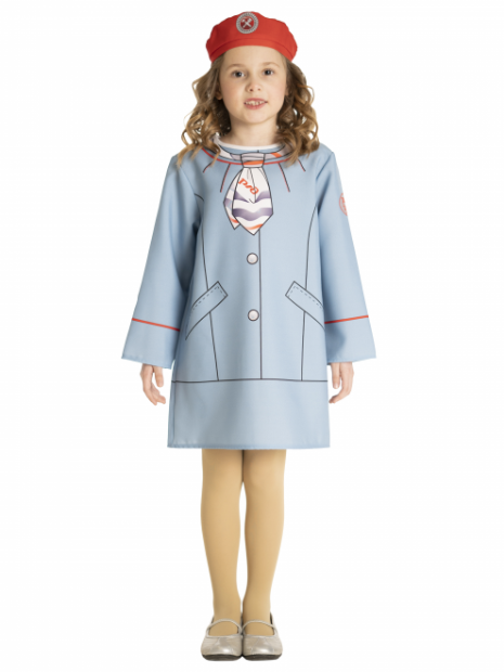 Костюм очень похож на форму проводницы, что позволяет ребенку примерить образ профессионала, поучаствовав в тематическом занятии или праздничном маскараде.