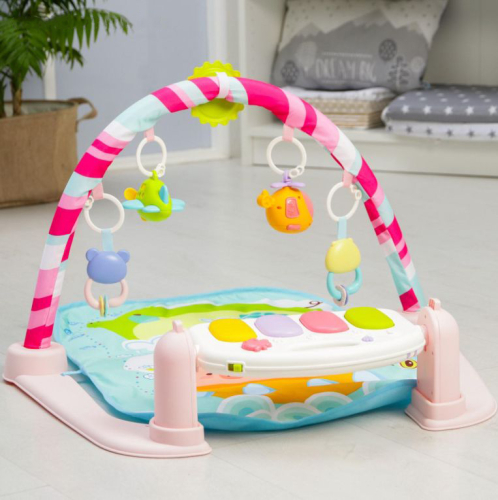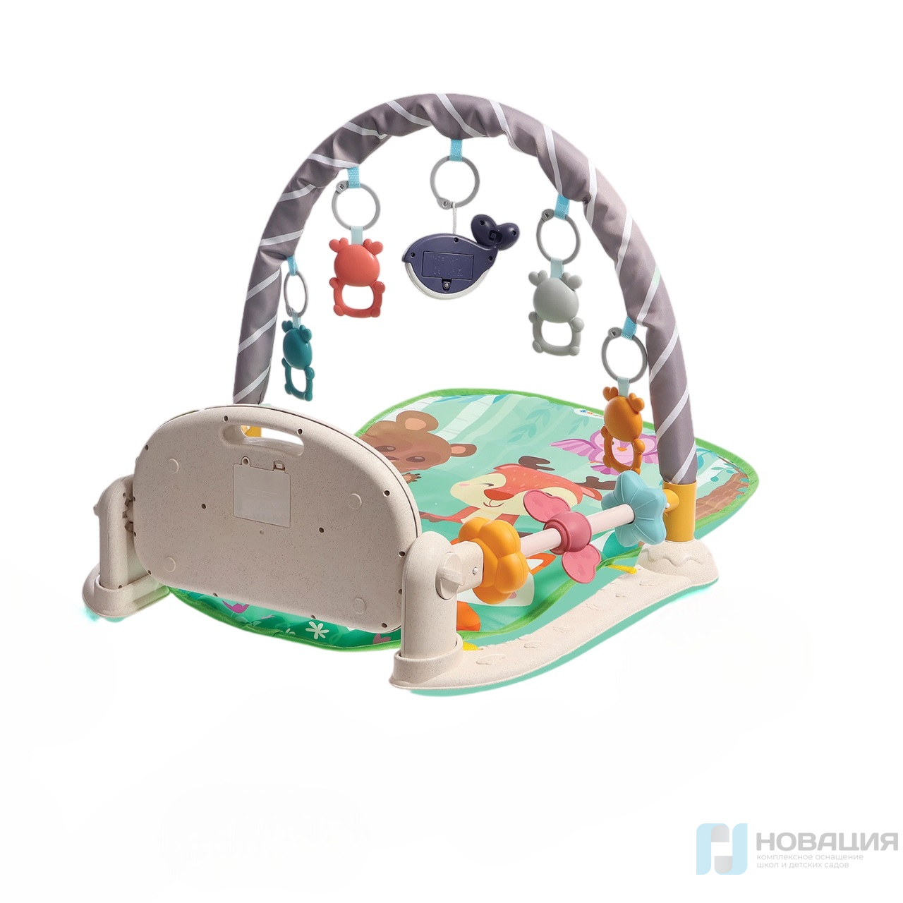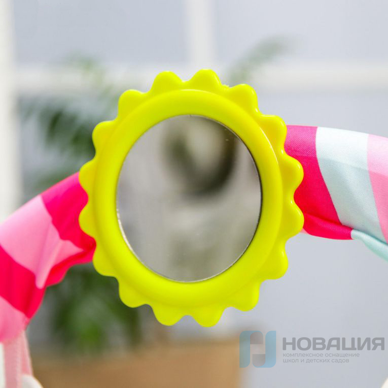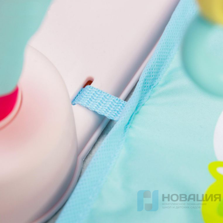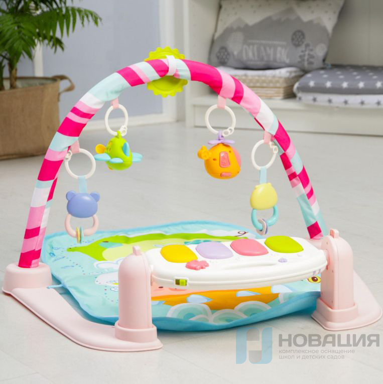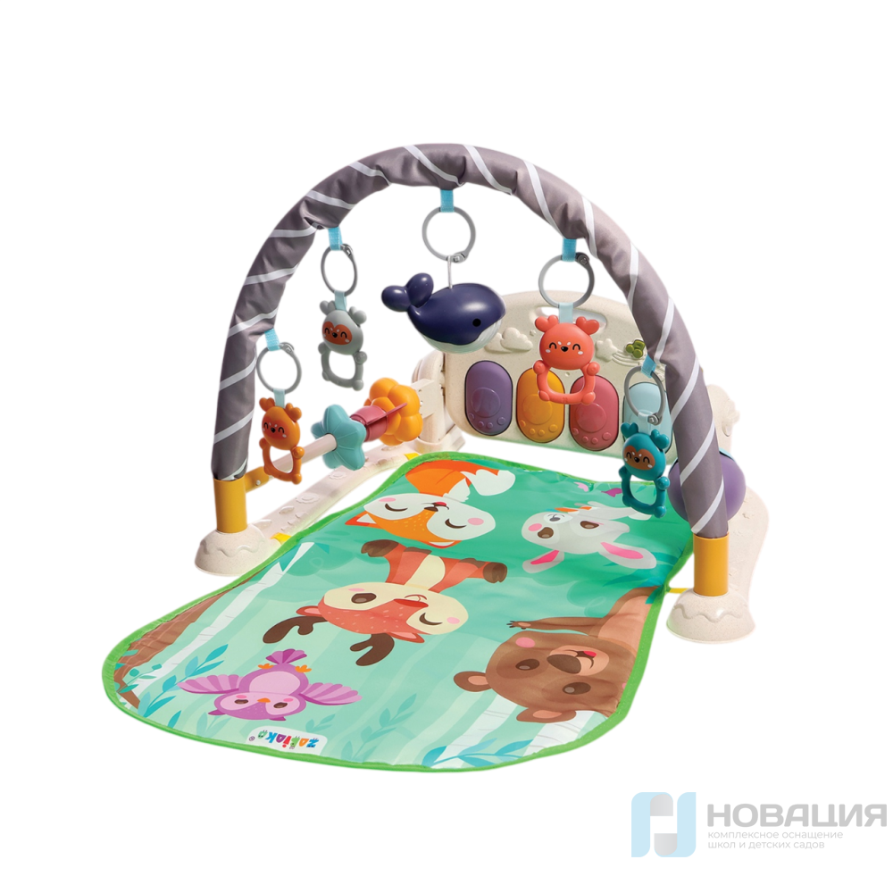 Во время эксплуатации над ярким ковриком ставится панель с клавишами и дуга с элементами на подвесах. Фигурки в виде животных оснащены петельками для закрепления хватательного рефлекса.