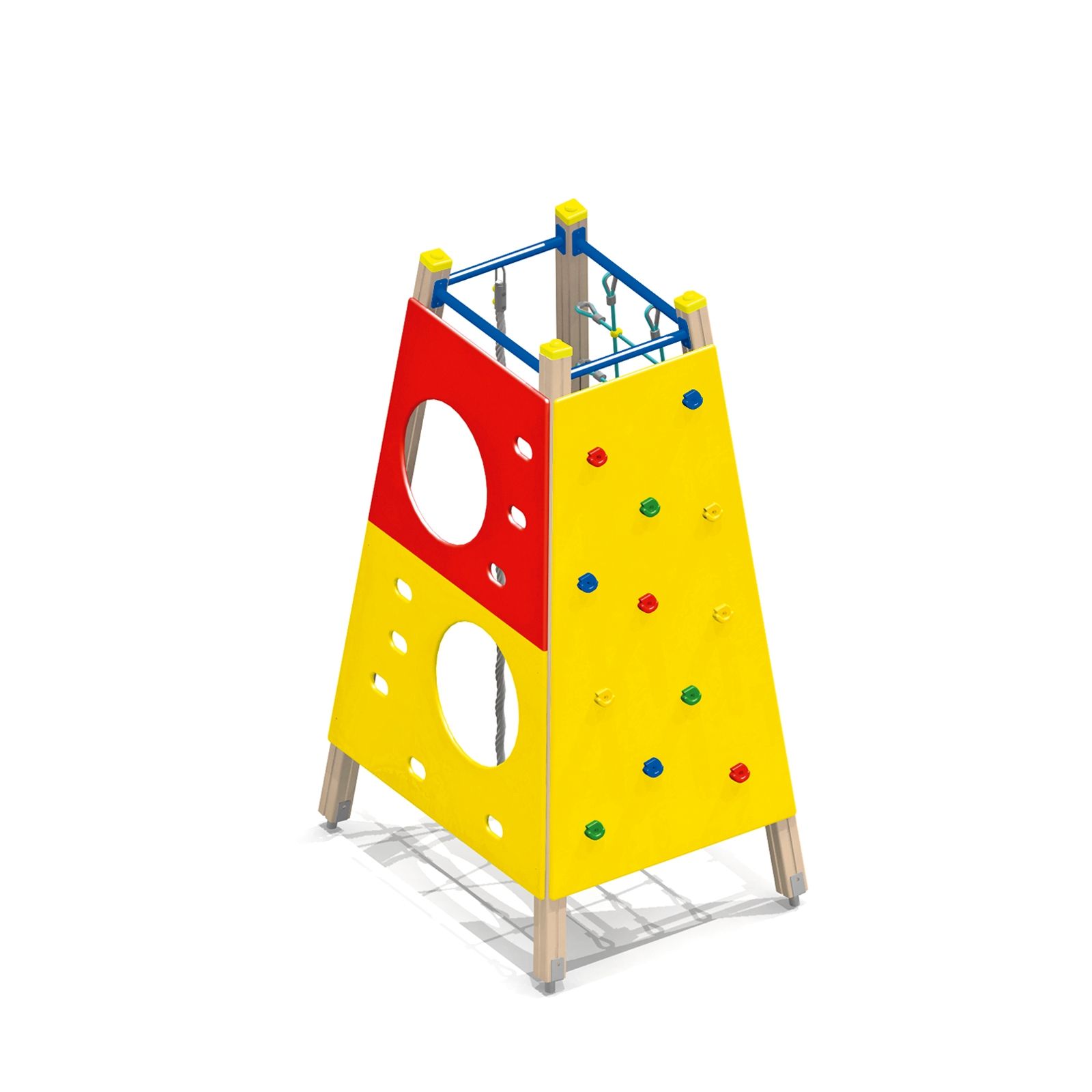 В составе комплекса: 3 альпинистские стенки с прорезями, сетка для лазания, перекладина и канат.