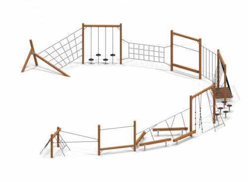 Сочетание тренажеров займет площадь 14870х18890 мм. Крепления оцинкованы. Многообразие спортивных модулей позволяет выполнять лазанье и вис, балансировать, кружиться для правильного формирования вестибулярного аппарата.