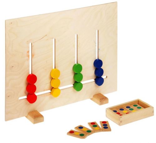 Развивающая панель представляет собой плоскую деревянную поверхность (прямоугольной формы, со скругленными углами, на подставке), имеющую прорези и дополненную круглыми элементами, окрашенными в 4 основных цвета.