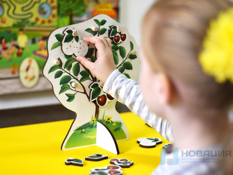 Дошкольник самостоятельно выбирает навесные элементы и распределяет их по имитации дерева.