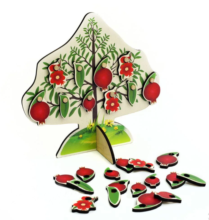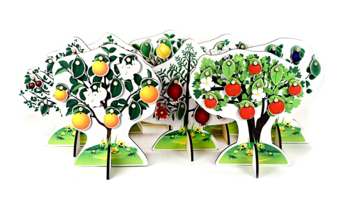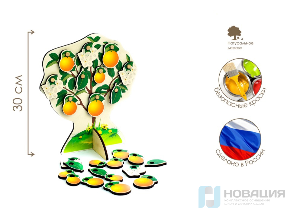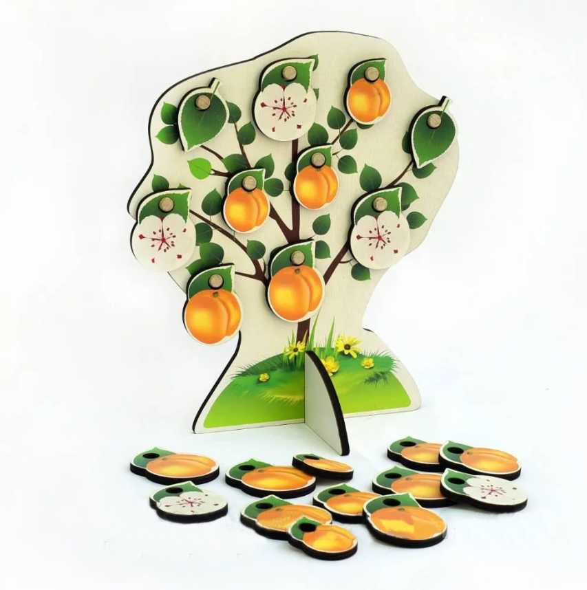 В комплекте 8 фигурок деревьев: яблоня, гранат, груша, апельсин, лимон, вишня, слива, персик. Каждое деревце оснащается листочками, плодами, цветами (по 5 шт.)