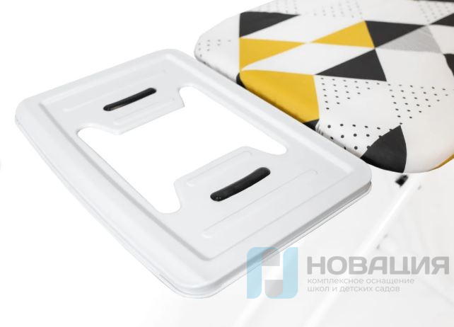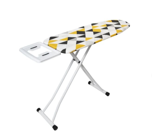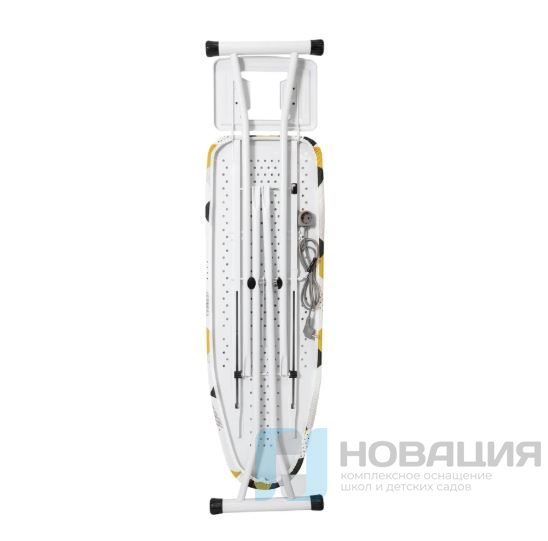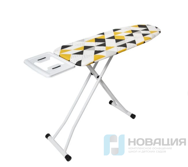 Гладильная доска с металлическим основанием, обтянутым съемным чехлом из хлопка. На торце предусмотрена подставка для утюга, а заужение одной стороны обеспечивает комфортную глажку сложных элементов одежды.