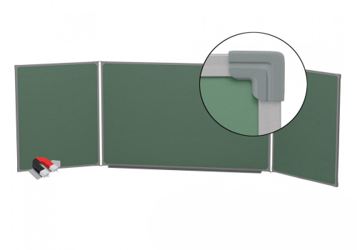 Школьная доска оснащается 2-мя подвижными секциями на петлях и 5-ю рабочими поверхностями для письма мелом. Стальные листы закрепляются в металлическом профиле с закругленными углами.