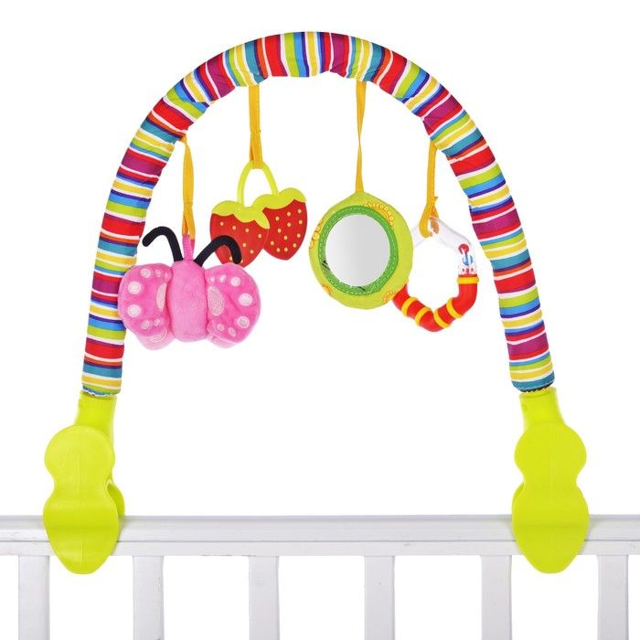 Мягкая дуга с игрушками на подвесах крепится к автокреслу, коляске или кроватке. Угол наклона меняется. Конструкцию легко зафиксировать без угрозы для здоровья ребенка. Фигурные элементы развивают зрительное и слуховое восприятие.