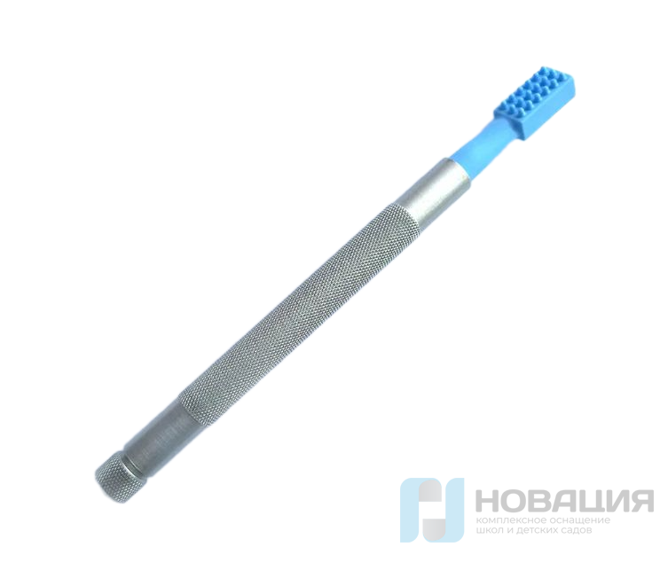 В алюминиевом корпусе расположен вибратор с элементом питания. Массажер предназначен для проведения логопедического массажа и подготовки артикуляционных мышц рта человека.