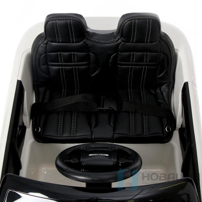 В комплект входят блок питания и пульт управления. Электромобиль заводится с ключа зажигания и развивает скорость 3-5 км/ч. Оснащен ремнем безопасности, портами USB и AUX. Предусмотрена встроенная музыка.