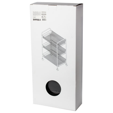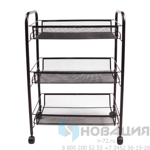 Максимальная нагрузка на каждый из 3 ярусов этажерки – до 5 кг. Изготовлена из прочного металла. Диаметр несущих трубок – 13 мм. Выполнена в черном цвете, который будет гармонировать с большинством офисных и домашних интерьеров. Этажерка оснащена самоориентирующимися колёсами, позволяющими с легкостью перемещать её во время уборки, не повреждая напольное покрытие. Размеры модели – 43,5х26х62,5 см. Вес – 2,2 кг.