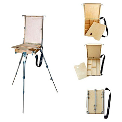 Представляет собой деревянный ящик с телескопическими ножками. Благодаря специальной конструкции ножек, представляется возможность регулировать этюдник по высоте. Ремень этюдника позволяет носить его в руках или на плече.