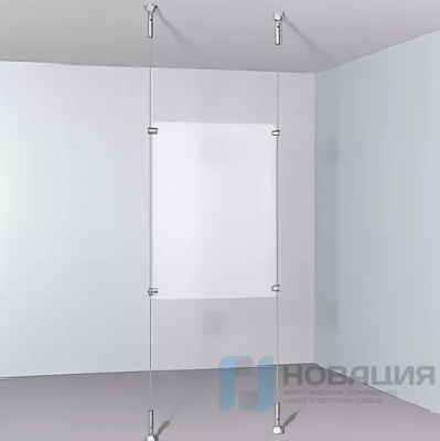 Конструкция состоит из креплений, между которыми протянут стальной трос. К нему подвешиваются прозрачные панели с держателями. Информация или изображение располагаются разных высотах, образуя единую композицию.