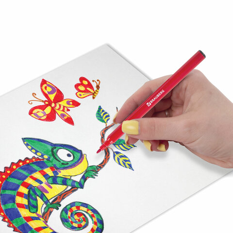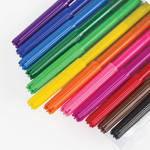 Обладают яркими насыщенными цветами в количестве 12 штук. Удобная круглая форма корпуса, длина которого 139 мм, а диаметр - 8,5 мм. Благодаря толщине линии письма 1 мм и диаметру пишущего узла 2,1 мм процесс раскрашивания становится легким. Длина письма составляет 600 м: такого расхода хватит надолго. Фломастеры изготовлены на водной основе, поэтому они безопасны и легко смываются с большинства материалов и кожи. Наконечник, устойчивый к продавливанию, не проваливается внутрь корпуса и не деформируется даже при сильном нажатии. Полипропиленовый корпус значительно продлевает срок службы фломастеров. Колпачок оснащен специальными прорезями для вентиляции, которые делают использование фломастеров более безопасным. Рекомендованы для детей от 3-х лет.
