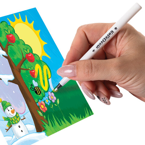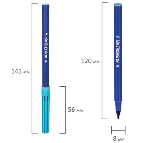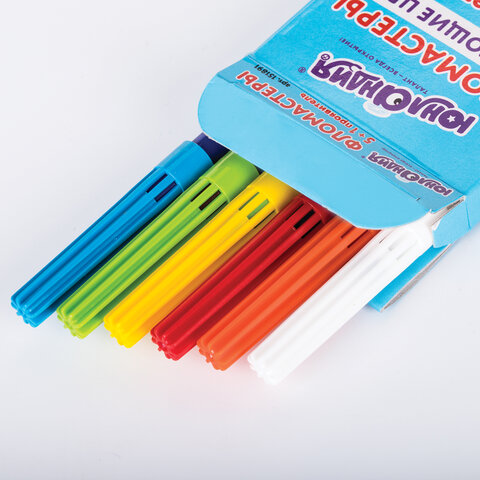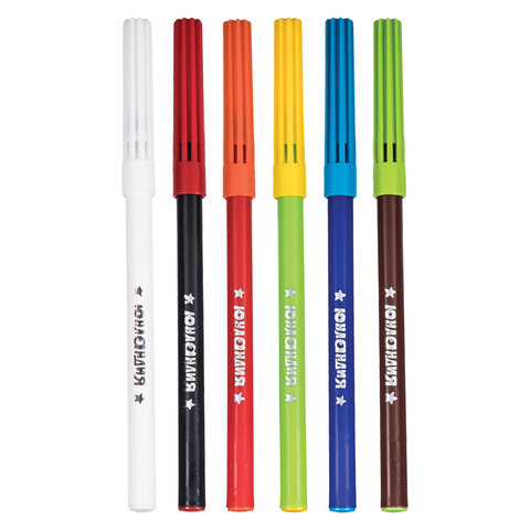 Фломастеры в количестве 5 штук + 1 белый фломастер-проявитель обладают яркими насыщенными цветами. Каждый фломастер имеет 2 цвета. Цвет корпуса соответствует основному цвету чернил, а цвет колпачка цвету, который проявляется после применения белого фломастера. Круглая форма корпуса, длина которого 145 мм, а диаметр 8 мм. Благодаря толщине линии письма 1 мм процесс раскрашивания становится легким. Длина письма составляет 400 м: такого расхода хватит надолго. Фломастеры изготовлены на водной основе, поэтому они безопасны и легко смываются с большинства материалов и кожи. Полипропиленовый корпус значительно продлевает срок службы фломастеров. Колпачок оснащен специальными прорезями для вентиляции, которые делают использование фломастеров более безопасным. Рекомендованы для детей от 3-х лет.