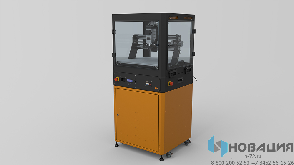 Опционально станок дополняется колпаком и/или тумбой. Колпак из прозрачного закаленного стекла защищает от летящей стружки, не мешая следить за процессом. Тумба используется как подставка и место хранения расходников.