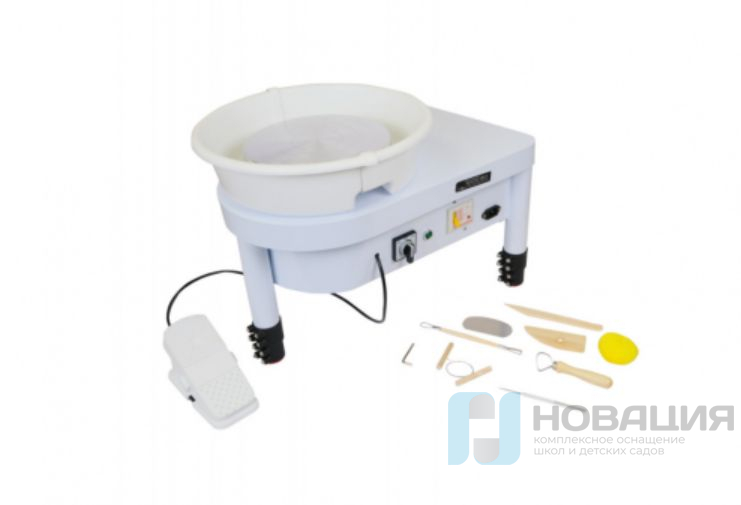 Высота стола регулируется от 28 до 38 сантиметров, длина провода педали составляет 900 мм. Круг способен обрабатывать керамическую массу весом до 4 килограммов.