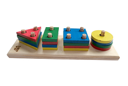 Набор для логопедических игр представлен дощечкой с 4-мя рядами одинаковых по размеру отверстий, в которые вставляются разные по цвету и размеру деревянные цилиндры. Задача ребенка — расположить детали в правильной последовательности.