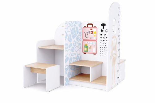 Игровая зона спроектирована для использования с разных сторон. Фасад подходит для приёмного покоя или кабинета врача с кушеткой, а также имеет системы хранения для игрушек. Обратная сторона включает кабинет для врачебного приёма с встроенным столом и стулом, а также отдельным табуретом и полками.
