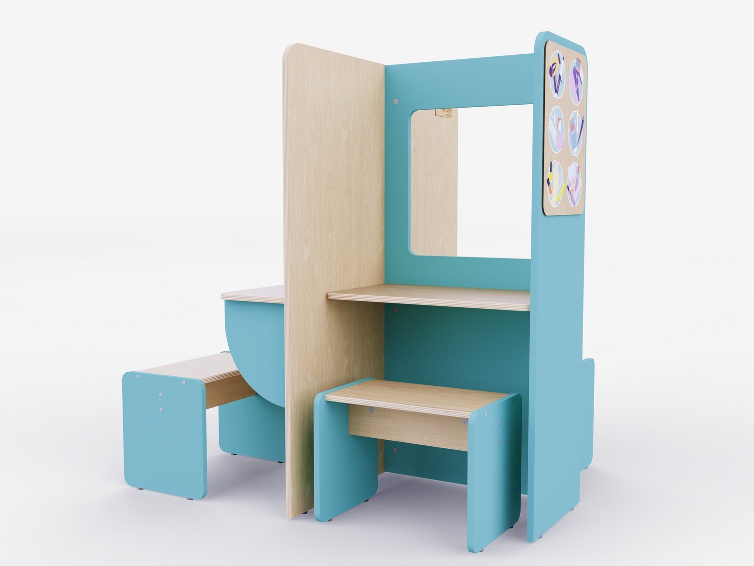 Конструкция разработана так, чтобы дети могли использовать все ее стороны. Каждая сторона отражает разные аспекты работы в салоне красоты: