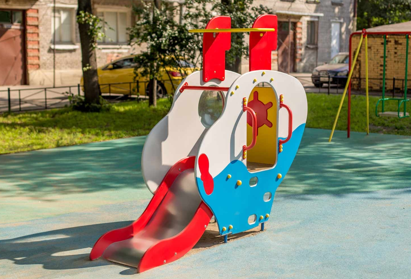 - горка со скатом из нержавеющей стали (1.5 мм), фанерными бортиками (h 100 мм), защитной секцией, перекладиной (d 33 мм),