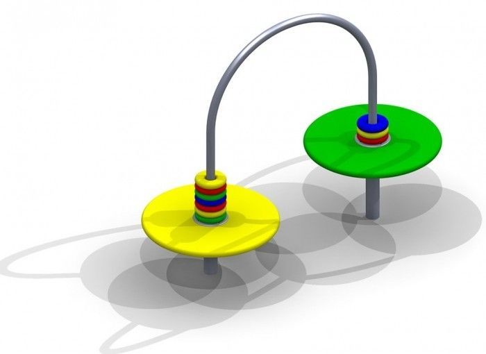 Конструкция представлена разновысокими столами, дугой на стойках и “баранками” из пластика или дерева.