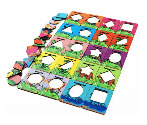Пособие состоит из пластин с цветными ячейками. На каждой ячейке нарисован динозавр, подписано название его вида. Часть изображения требуется восстановить: вставить фигурный вкладыш в отверстие.