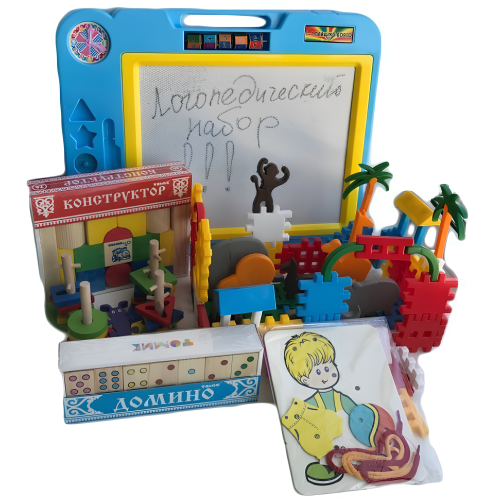 Игровой набор для логопедического кабинета включает в себя игры на развитие логического мышления, тактильных навыков и мелкой моторики.