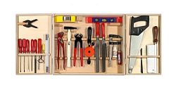 Игровой набор в 3-створчатом ящике с выдвижными секциями для хранения мелочей знакомит младших школьников с видами инструментов, которые необходимы для трудовой деятельности (столярных и слесарных работ).