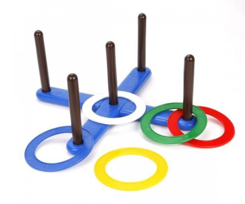 Кольцеброс подходит для игр в детском бассейне. Крестообразная опора удерживается на поверхности воды. По краям каждого луча и в центре устанавливаются разноцветные стойки. На каждую стойку забрасывается кольцо соответствующего цвета. Занятия с кольцебросом развивают меткость и вырабатывают способность к цветоразличению.