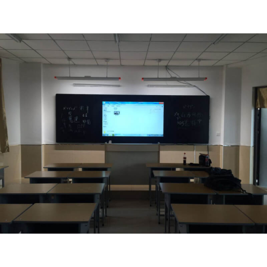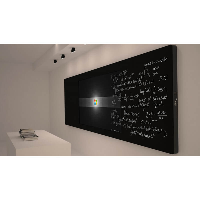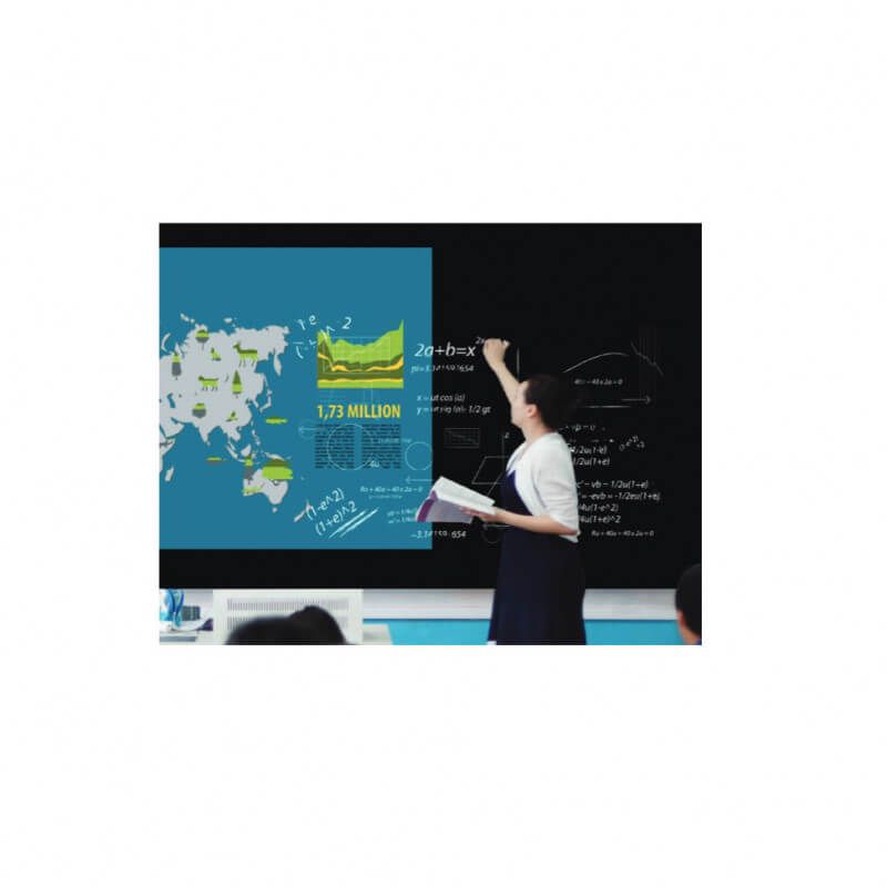 Доска выполняет функцию поверхности для письма и мультимедийного проигрывателя. Интерактивный экран одним движением можно сдвинуть вниз, и продолжать вести записи мелом или стилусом по всей поверхности.
